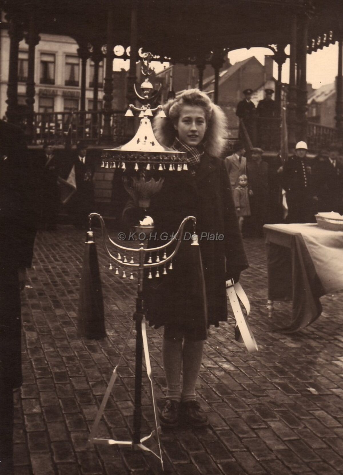 Vaderlandse plechtigheid op het Wapenplein,een meisje bij het muziekinstrument dat zal overhandigd worden aan de harmonie van de Zeemacht.