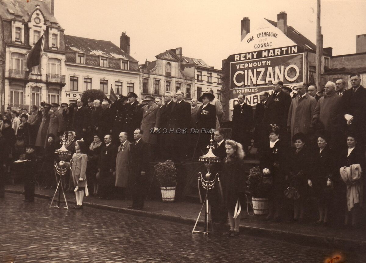 De eretribune op het Wapenplein tijdens een herdenking van het einde van W. O. II met centraal Hendrik SERRUYS,burgemeester.