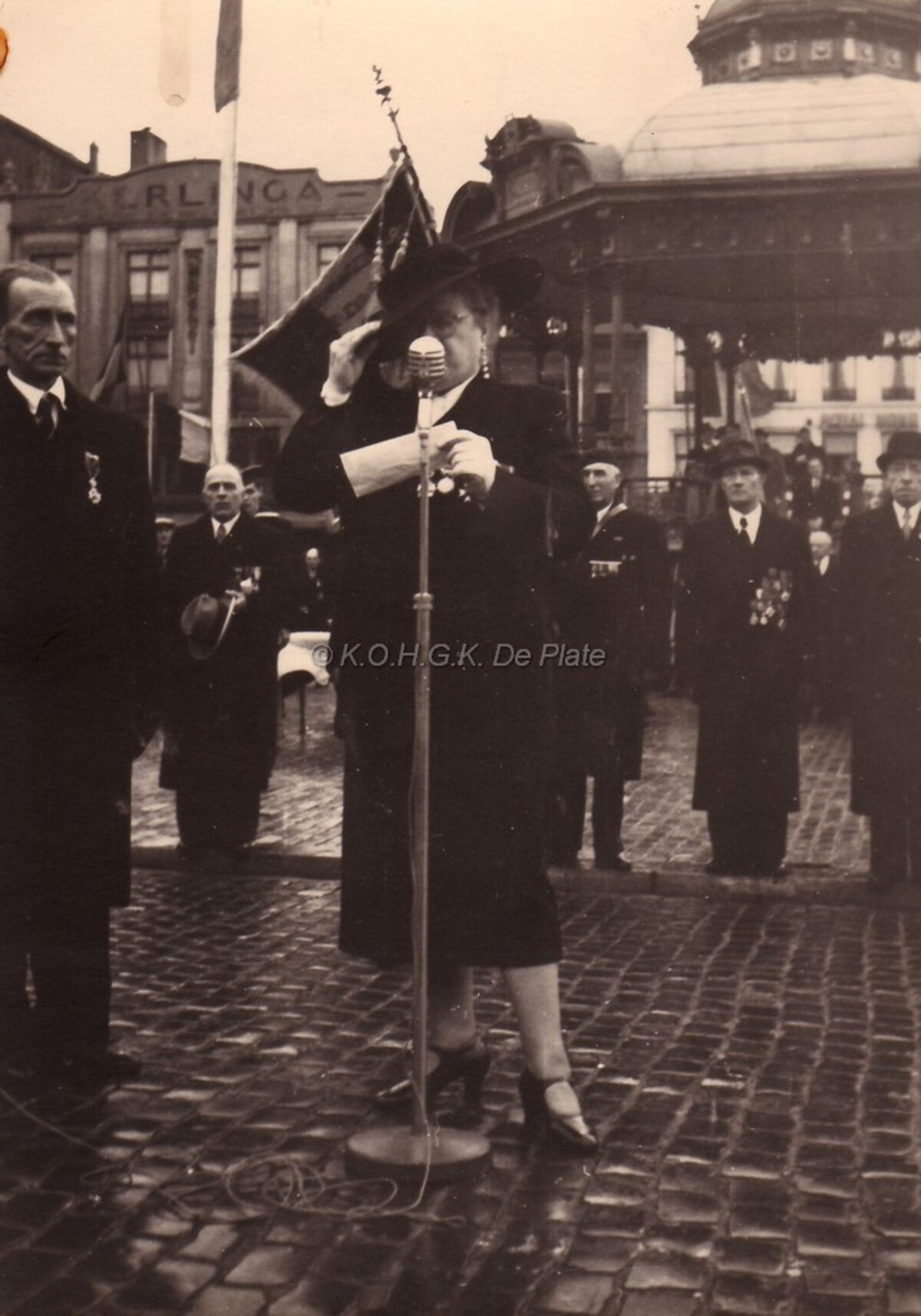 Een oudstrijdster houdt een toespraak tijdens eeen herdenking van het einde van W.O. I op het Wapenplein,achter haar de kiosk en op de achtergrond Hotel "Kerlinga".