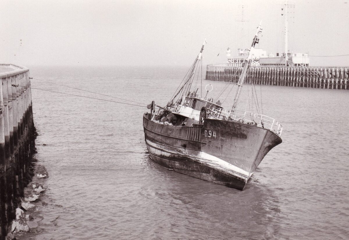 Formaat : 13 x 18 cm. - 11 maart 1955, de O.94 Esperance is vastgelopen in de havengeul bij het Weststaketsel.