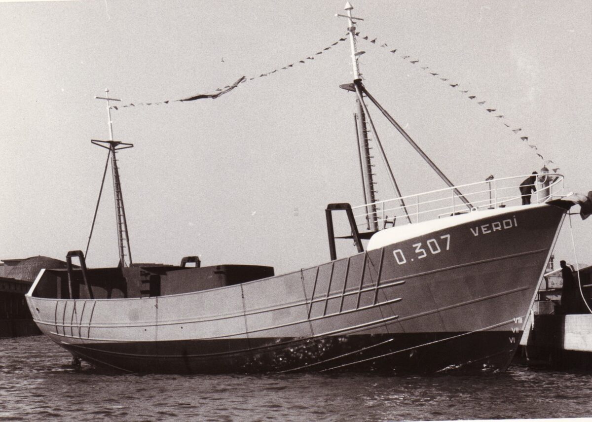 De O.307 "Verdi" na haar tewaterlating. Stalen motortreiler gebouwd op de werf J. Deweert voor rekening van PVBA De Noordzee.