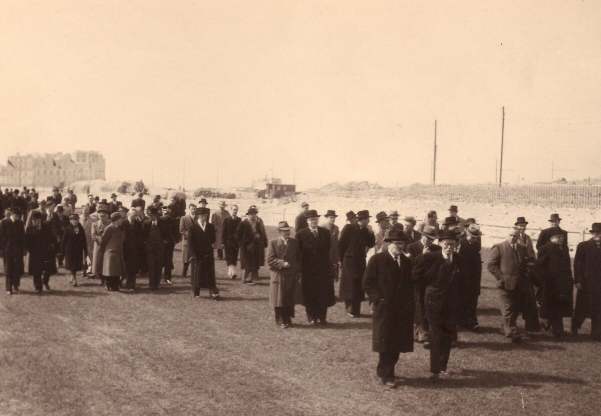 Formaat : 13 x 18 cm. - Heropbouw van de renbaan na de Tweede Wereldoorlog. Eerste steenlegging van de nieuwe tribune op 11 april 1947.