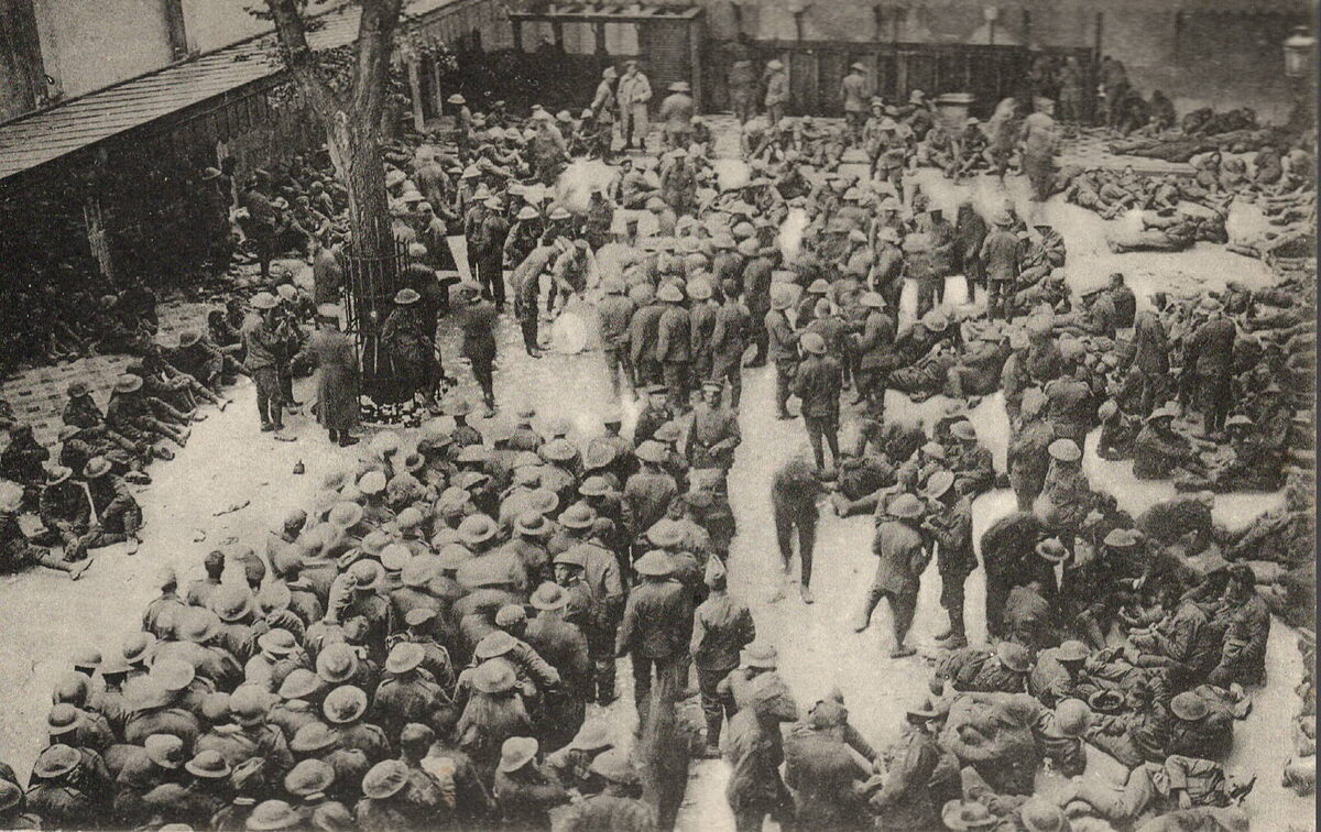 Nels. Edition Baervoets, Ostende. - Ostende - Dans la cour de la Kommandantur : prisonniers capturés le 14 juillet 1917. - Naar aanleiding van operatie "Strandfest" werden ongeveer 1250 Britten krijgsgevangenen genomen. Hier een groot aantal van hen op de koer van de Albertschool, toen Kommandantur.