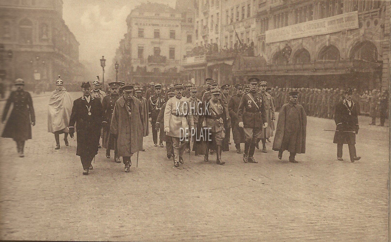 N°5. Des délégations nombreuses d'officiers alliés suivent le corps du Soldat Inconnu. On reconnait au premier rang, de gauche à droite, le maréchal anglais French, le général français Desgouttes, le général italien Pecori Giraldi, le général américain Allen et un général japonais. - Map 029A/63e