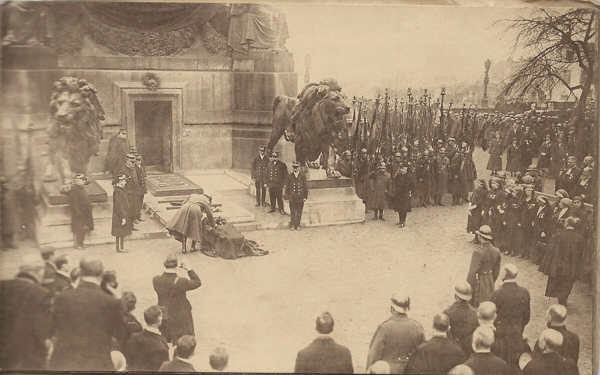 N°6. Au pied de la colonne du Congès le cercueil enveloppé d'un drapeau national et contenant les restes du Soldat Inconnu est déposé : Le Roi confère à l'Anonyme toutes les décorations Belges de guerre. - Map 029A/63f