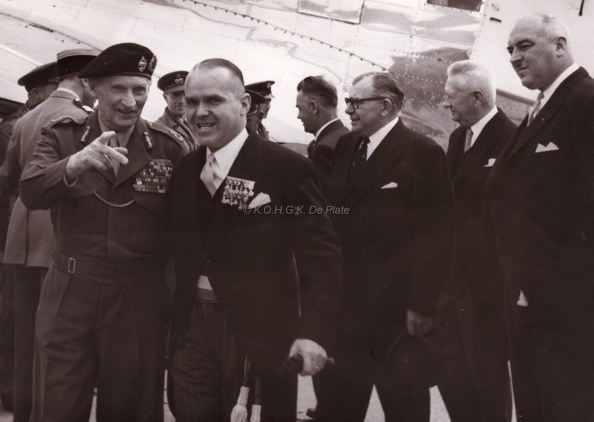 Onderonsje tussen veldmaarschalk MONTGOMERY en burgemeester Adolf VAN GLABBEKE bij zijn vertrek na het tweede bezoek aan onze stad. Op de foto ook uiterst rechts schepenen Maurice QUAGHEBEUR en Emiel VROOME.