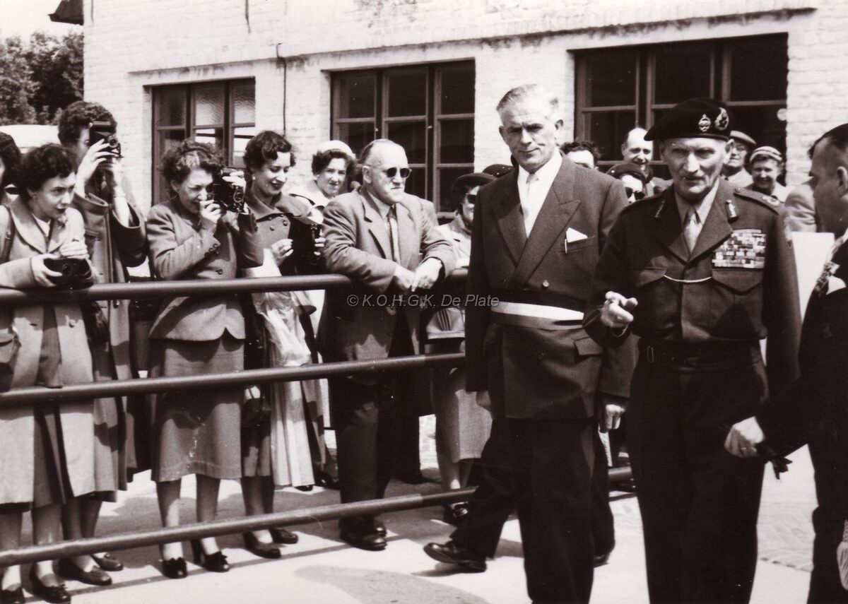 Aankomst van veldmaarschalk MONTGOMERY op het vlIegveld van Raversijde. Links de burgemeester van Middelkerke, André TITECA en rechts burgemeester Adolf VAN GLABBEKE.
