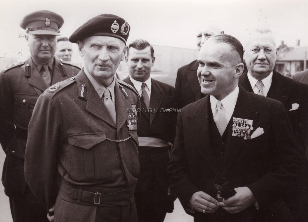 Veldmaarschalk MONTGOMERY en burgemeester Adolf VAN GLABBEKE bij zijn vertrek na het tweede bezoek aan onze stad. Rechts achter de burgemeester schepen Emiel VROOME.