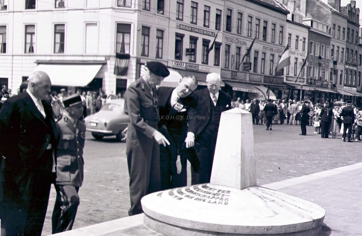 De Visserskaai ter hoogte van het Vissersplein. Veldmaarschalk MONTGOMERY bekijkt samen met burgemeester Adolf VAN GLABBEKE het zuiltje dat ter gelegenheid van zijn bezoek op 3 april 1948 aan onze stad geplaatst werd. Naast de burgemeester staat rechts, stadssecretaris Michel SURMONT en links schepen Maurice QUAGHEBEUR