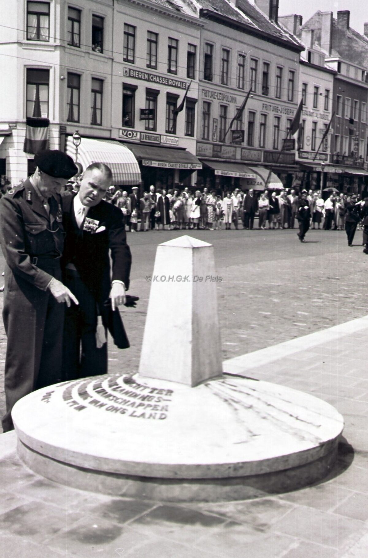 Veldmaarschalk MONTGOMERY en burgemeester Adolf VAN GLABBEKE , hier op de Visserskaai, bekijken het herdenkingszuiltje geplaatst naar aanleiding van zijn eerste bezoek op 3 april 1948