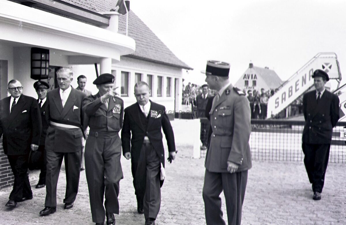 Aankomst van veldmaarschalk MONTGOMERY op het vliegveld van Raversijde. Rechts, burgemeester Adolf VAN GLABBEKE en links, André TITECA, burgemeester van Middelkerke.