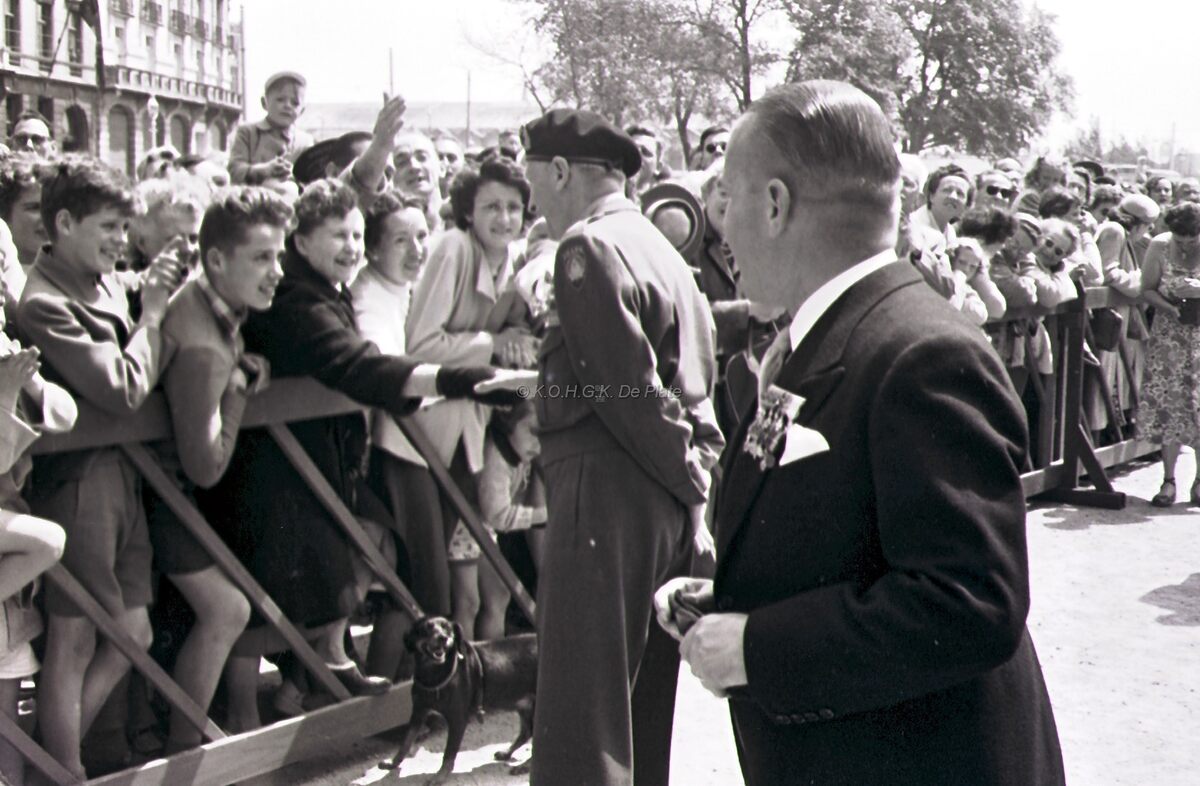 Veldmaarschalk Montgomery en burgemeester Adolf VAN GLABBEKE begroeten de bevolking op het Canadaplein.