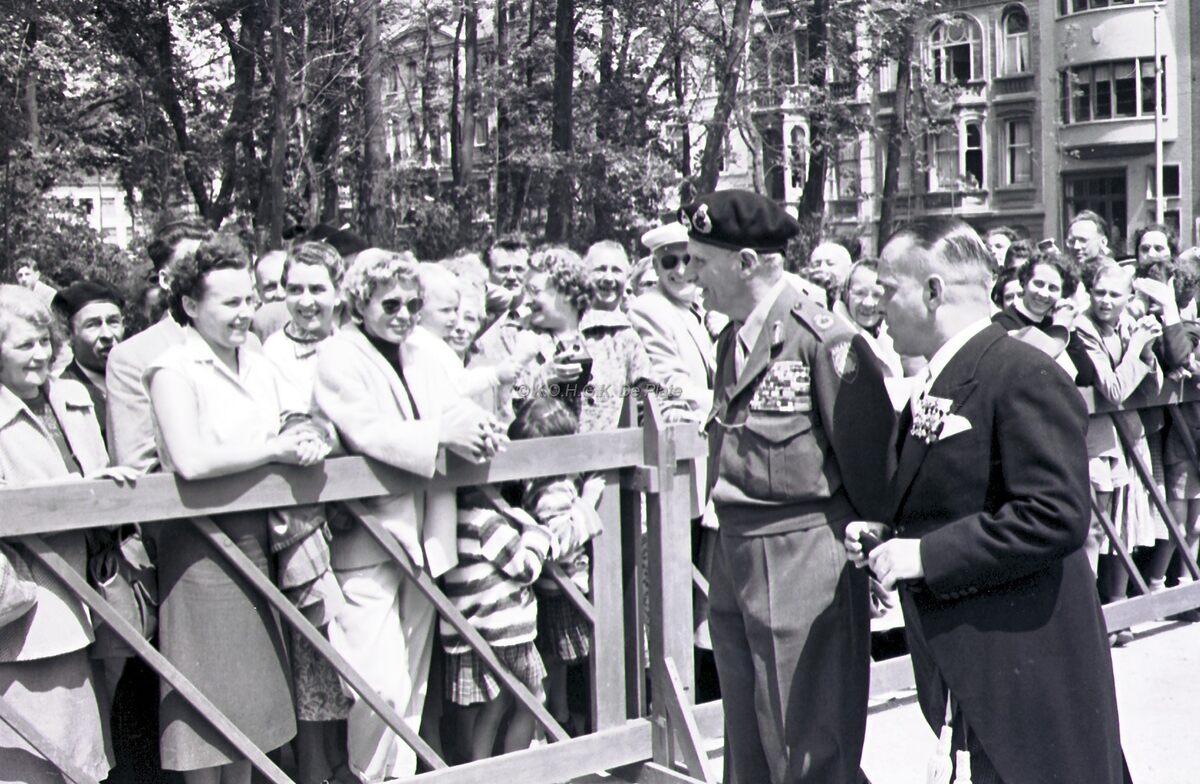 Veldmaarschalk MONTGOMERY en burgemeester Adolf VAN GLABBEKE begroeten de bevolking op het Canadaplein