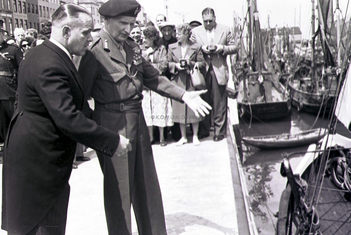 Veldmaarschalk MONTGOMERY en burgemeester Adolf VAN GLABBEKE op de Visserskaai nabij het Montgomerydok.