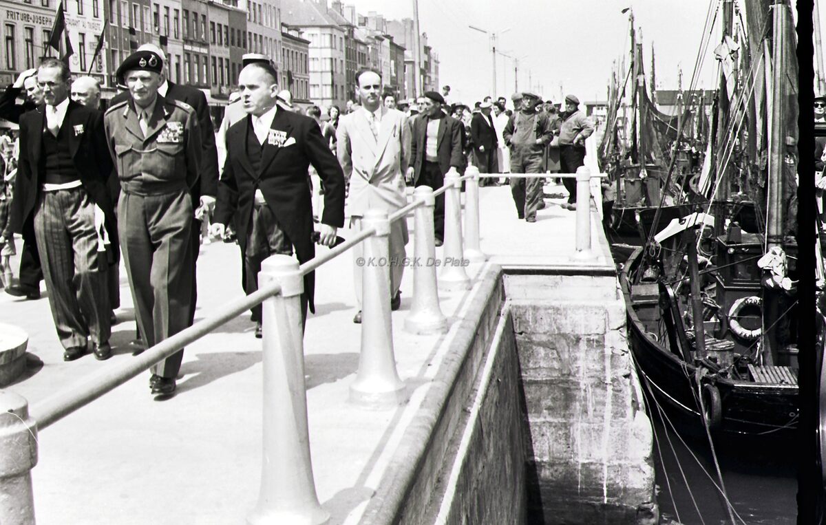 Veldmaarschalk MONTGOMERY en burgemeester Adolf VAN GLABBEKE op de Visserskaai. Links schepen Frans VAN CAILLIE