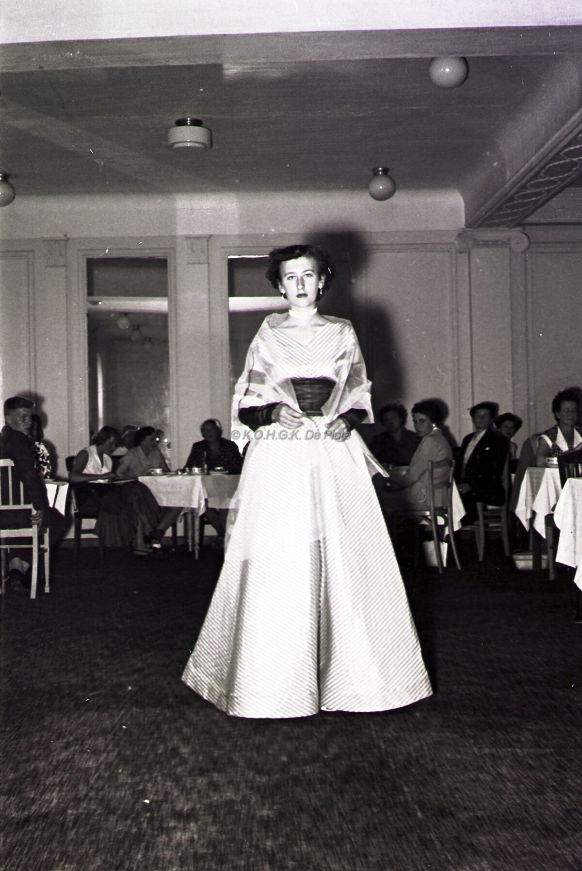 Foto : Modeshow "Snij- en Naaischool Hilda Ureel". Hôtel de la Couronne. 1954