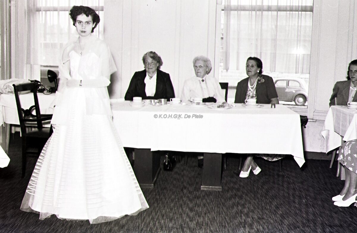 Foto : Modeshow "Snij- en Naaischool Hilda Ureel". Hôtel de la Couronne. 1954