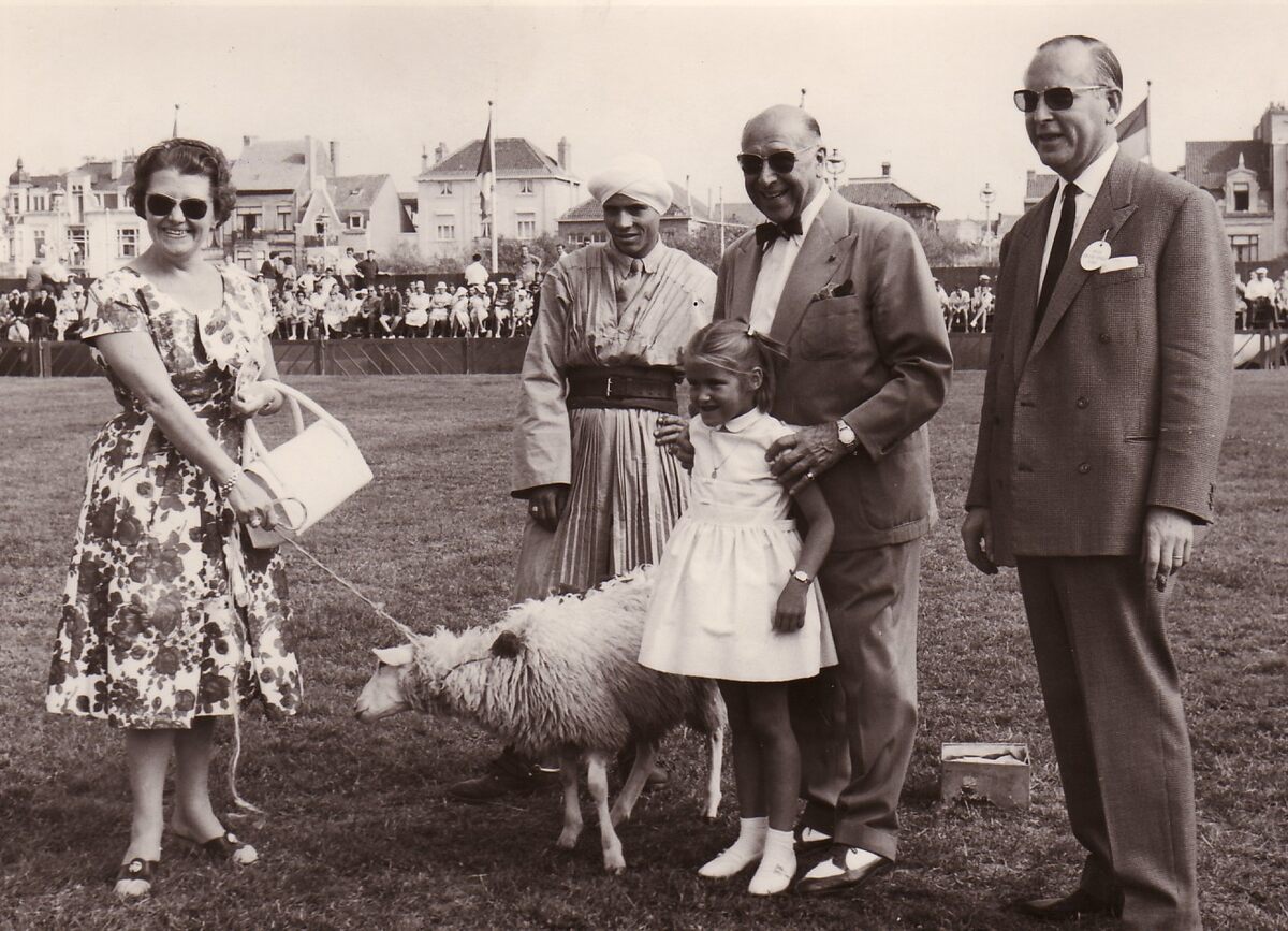 Een Spahi (Noord Afrikaans ruiter in dienst van het Frans leger) met enkele inrichters van een ruiterfeest op het terrein aan de Koninklijke Gaanderijen.Op de achtergrond de Wellingtonstraat.