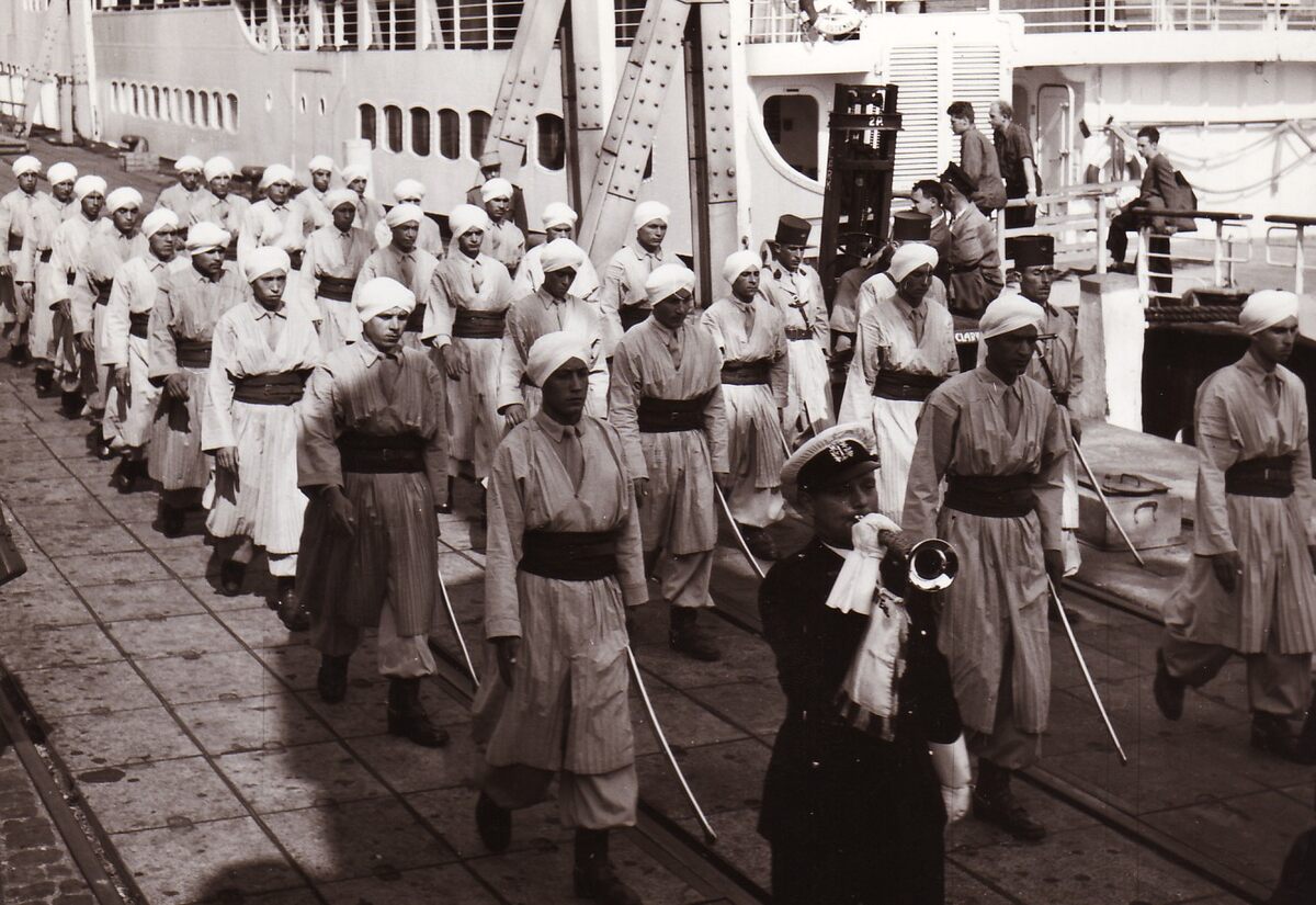Een afdeling van de Spahis (Noord Afrikaanse ruiters in dienst van het Frans leger) op de Natiënkaai bij een aangemeerde ferry.