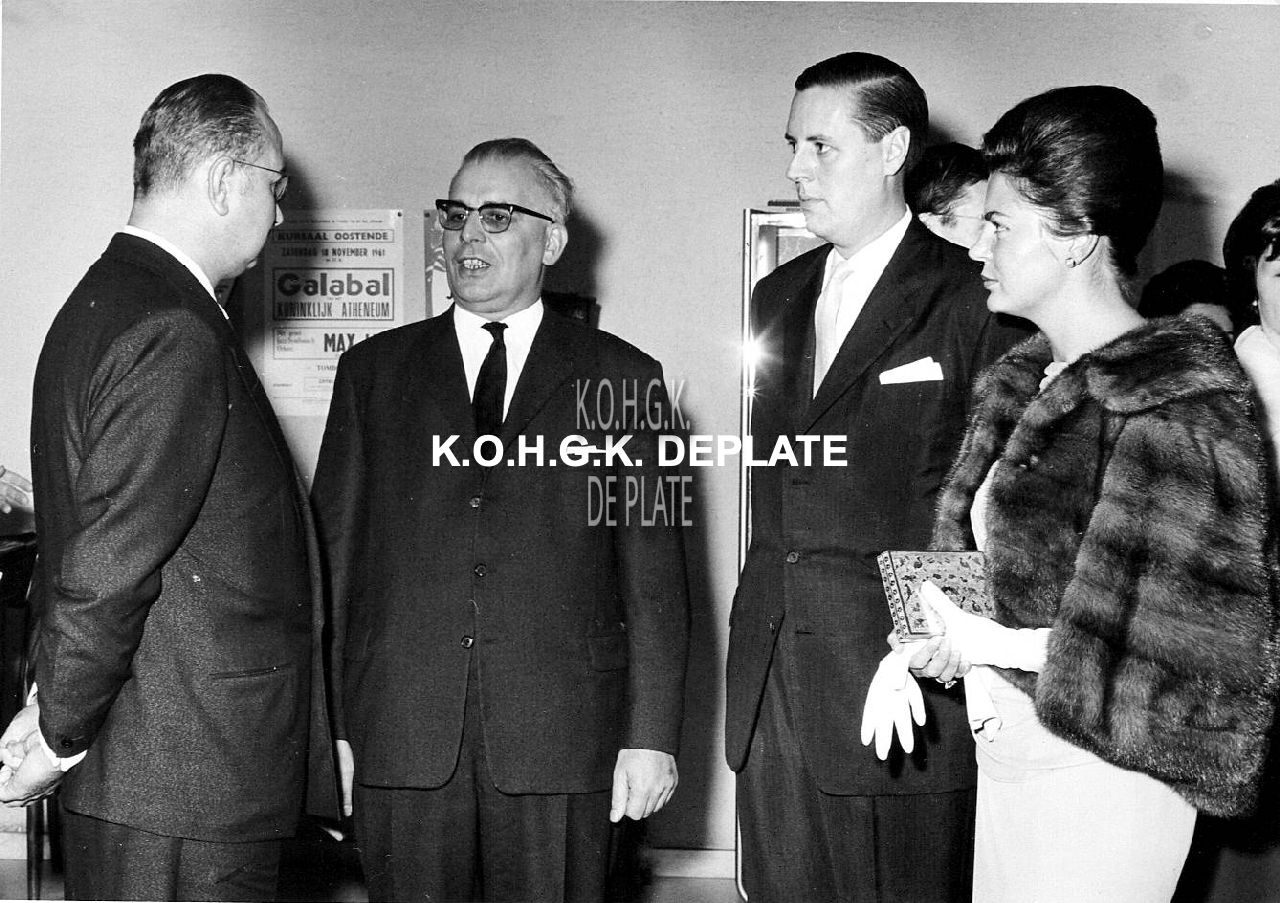 Formaat : 13 x 18 cm. - Minister Alfred Bertrand in gesprek met Roger De Ramée, directeur van de Kursaal. Hij was toen minister van Verkeerswezen. Rechts, mevrouw De Ramée en naast haar burgemeester Jan Piers.