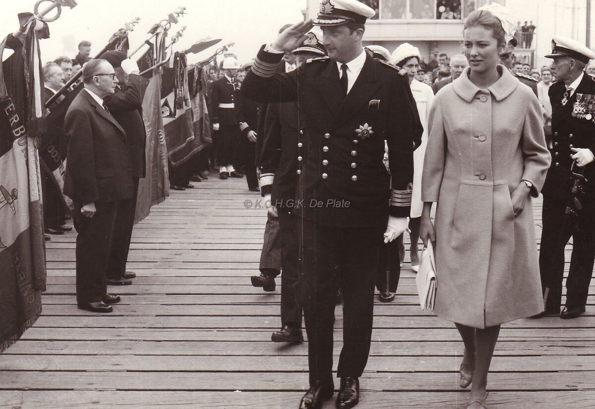 Het prinsenpaar Albert en Paola gaan voorbij de vaandels van de oudstrijdersverenigingen, opgesteld op het westerstaketsel aan de N.S.Y.C. tijdens hun intrede te Oostende.