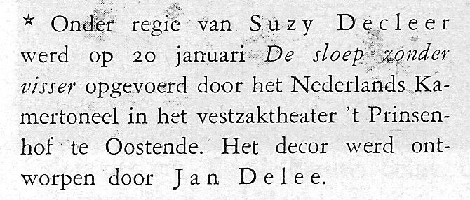 Trefwoorden NEDERLANDS KAMERTONEEL DE SLOEP ZONDER VISSER (TONEELSTUK) TONEELSTUKKEN DECLEER SUZY (TONEELSPEELSTER TONEELREGISSEUSE) PRINSENHOF (IEPERSTRAAT) DE LEE JAN (1932-2000) (KUNSTSCHILDER) Plaatskenmerk ARCHIEF 117.9 - VLAA1957 januari 1957 Volume 6 Nummer 1 Bron West-Vlaanderen Pagina's 58 Print