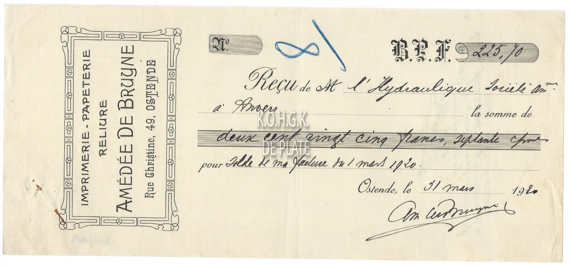 Trefwoorden HANDEL ; ONTVANGSTBEWIJZEN AMÉDÉE DE BRUYNE (PAPIERHANDEL DRUKKERIJ) CHRISTINASTRAAT DRUKKERIJEN Plaatskenmerk ARCHIEF 110 ARCHIEFDOOS HANDEL Inventarisnummers 2023/0068 31/ 03/ 1920 Herkomst MAJOR WALTER Print