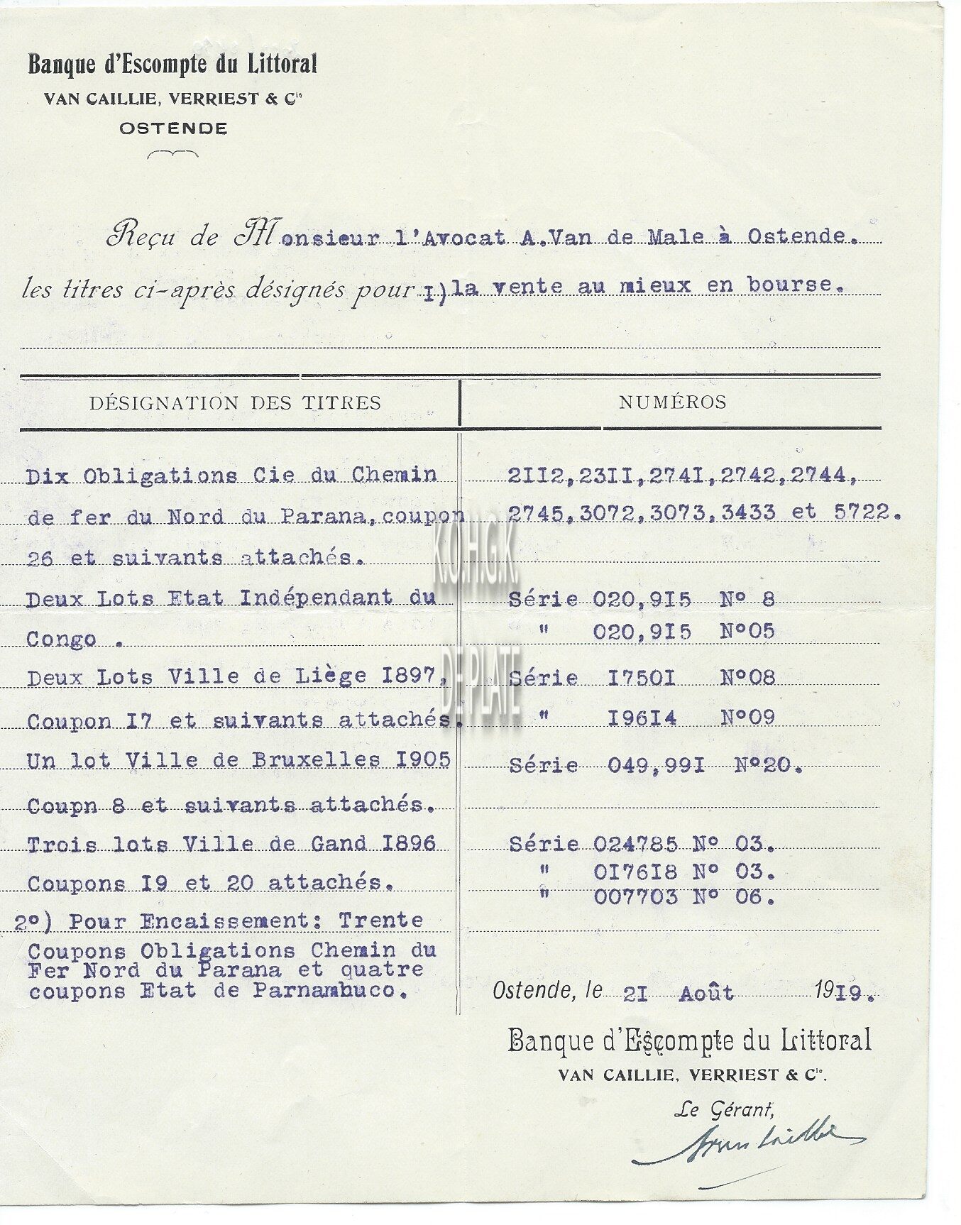 Trefwoorden HANDEL ; ONTVANGSTBEWIJZEN BANQUE D'ESCOMPTE DU LITTORAL VAN CAILLIE VERRIEST EN C° (BANK) HANDEL ; BANKWEZEN ROGIERLAAN Plaatskenmerk ARCHIEF 110 ARCHIEFDOOS HANDEL Inventarisnummers 2022/0480 21/ 08/ 1919 Herkomst AANKOOP Print
