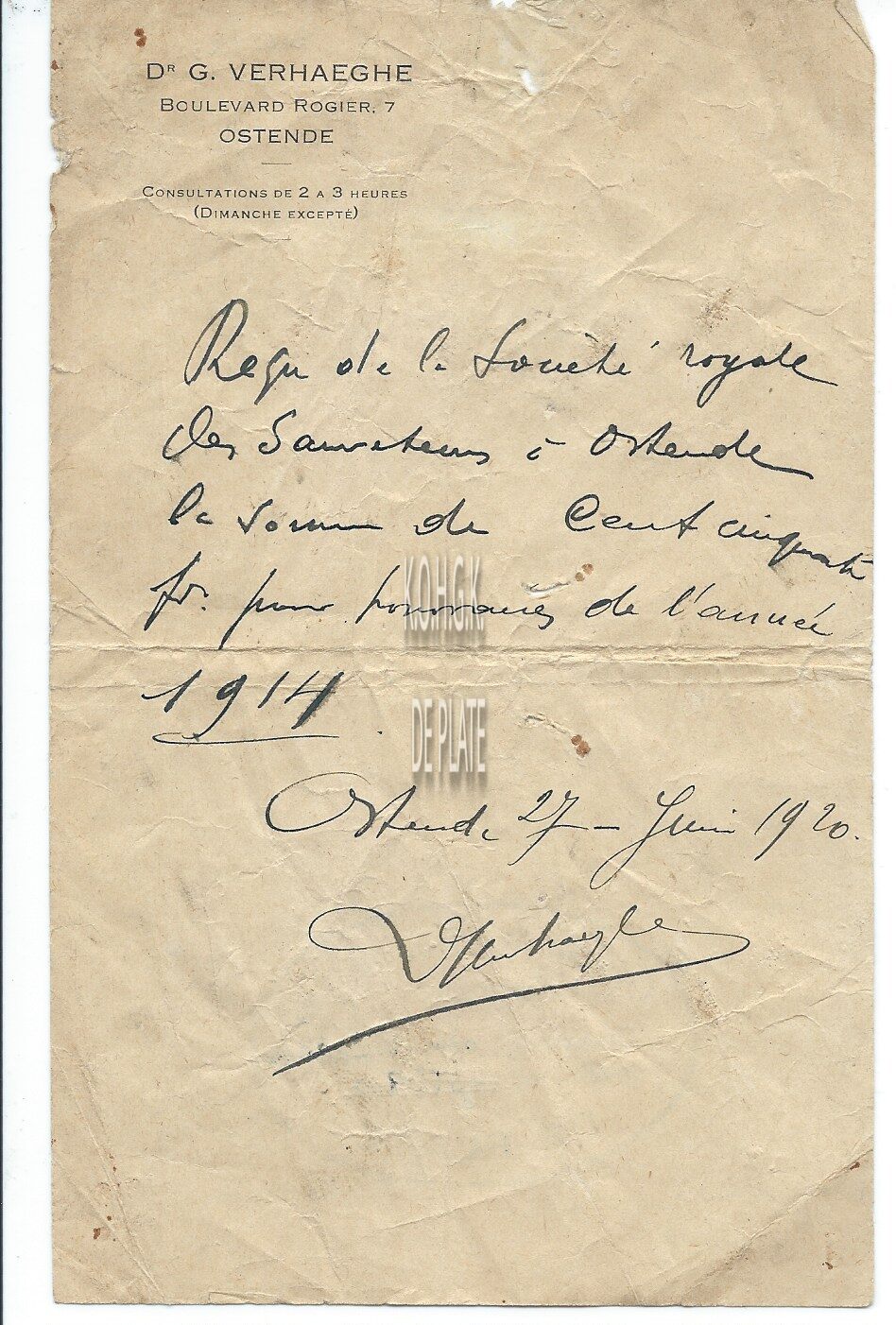 Trefwoorden GEZONDHEIDSZORG ; ONTVANGSTBEWIJZEN VERHAEGHE G. (GENEESHEER) ROGIERLAAN Plaatskenmerk ARCHIEF 110 ARCHIEFDOOS HANDEL Inventarisnummers 2022/2321 27/ 06/ 1920 Herkomst BERARD JULIEN Print