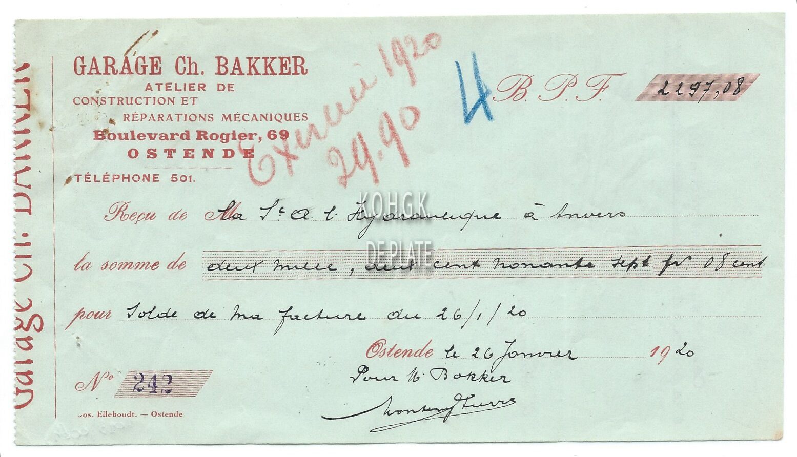 Trefwoorden HANDEL ; ONTVANGSTBEWIJZEN GARAGE CH. BAKKER VERVOER ; GARAGES ROGIERLAAN Plaatskenmerk ARCHIEF 110 ARCHIEFDOOS HANDEL Inventarisnummers 2023/0064 26/ 01/ 1920 Herkomst MAJOR WALTER Vervaardiger Imp. Elleboudt Print