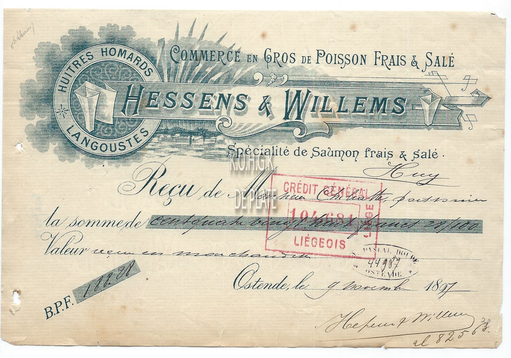 Omschrijving Commerce en gros de poisson frais et salé. Spécialité de saumon frais et salé Trefwoorden HANDEL ; ONTVANGSTBEWIJZEN HESSENS EN WILLEMS (SCHAAL- EN SCHELPDIEREN VISHANDEL) HANDEL ; SCHAAL- EN SCHELPDIEREN HANDEL ; VISHANDEL Plaatskenmerk ARCHIEF 110 ARCHIEFDOOS HANDEL Inventarisnummers 2022/2271 09/ 11/ 1897 Herkomst AANKOOP Print