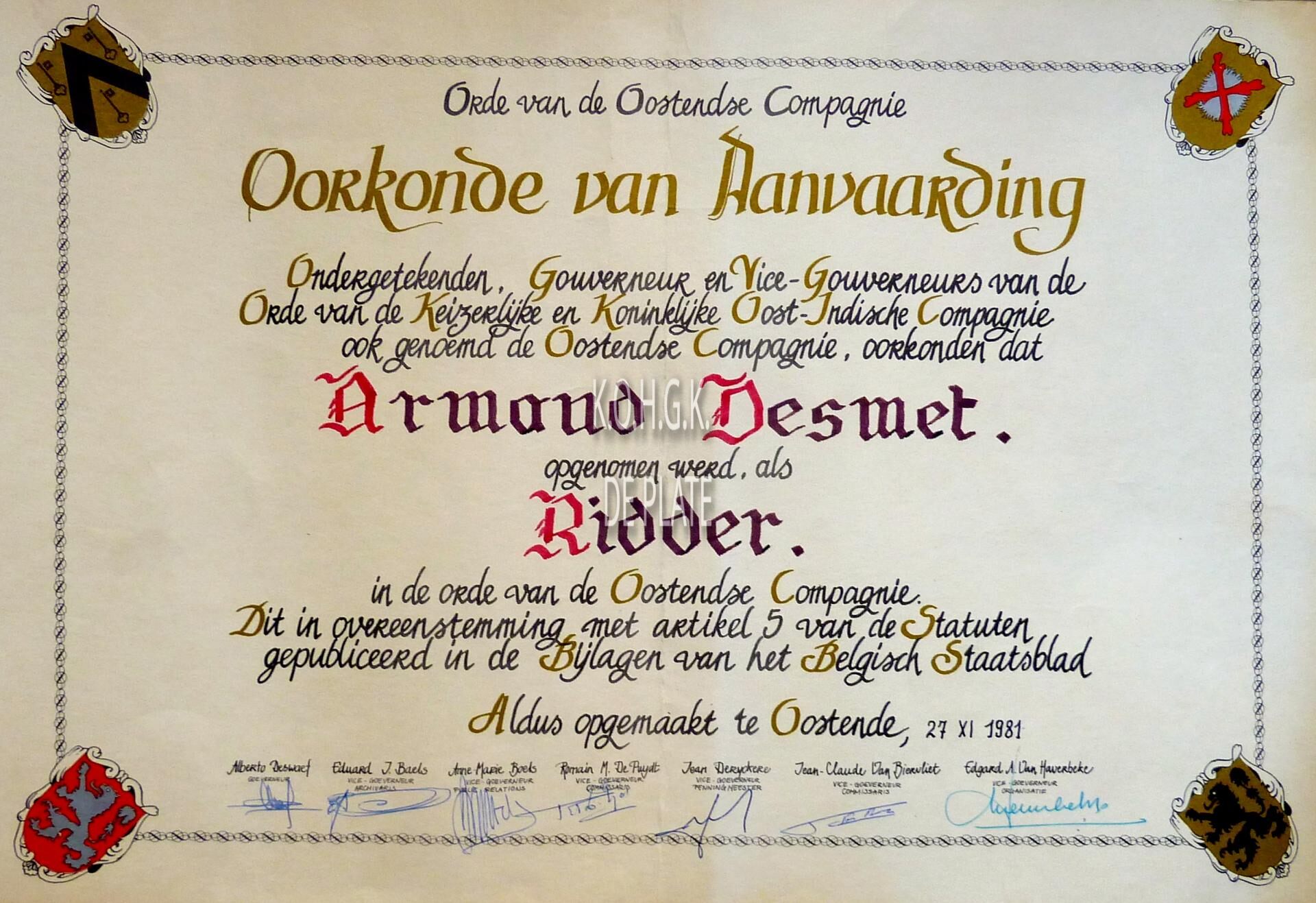 Trefwoorden OORKONDEN DESMET ARMAND (°1931- ) (ZEEMAN) ORDE VAN DE OOSTENDSE COMPAGNIE (SOCIO-CULTURELE VERENIGING) Plaatskenmerk ARCHIEF 117.5 - LKD/04/ Inventarisnummers 2009/0063 27/ 11/ 1981 Collectie Grote archieven Uitgever Orde Oostendse Compagnie formaat_extern 31 x 45 cm. Print