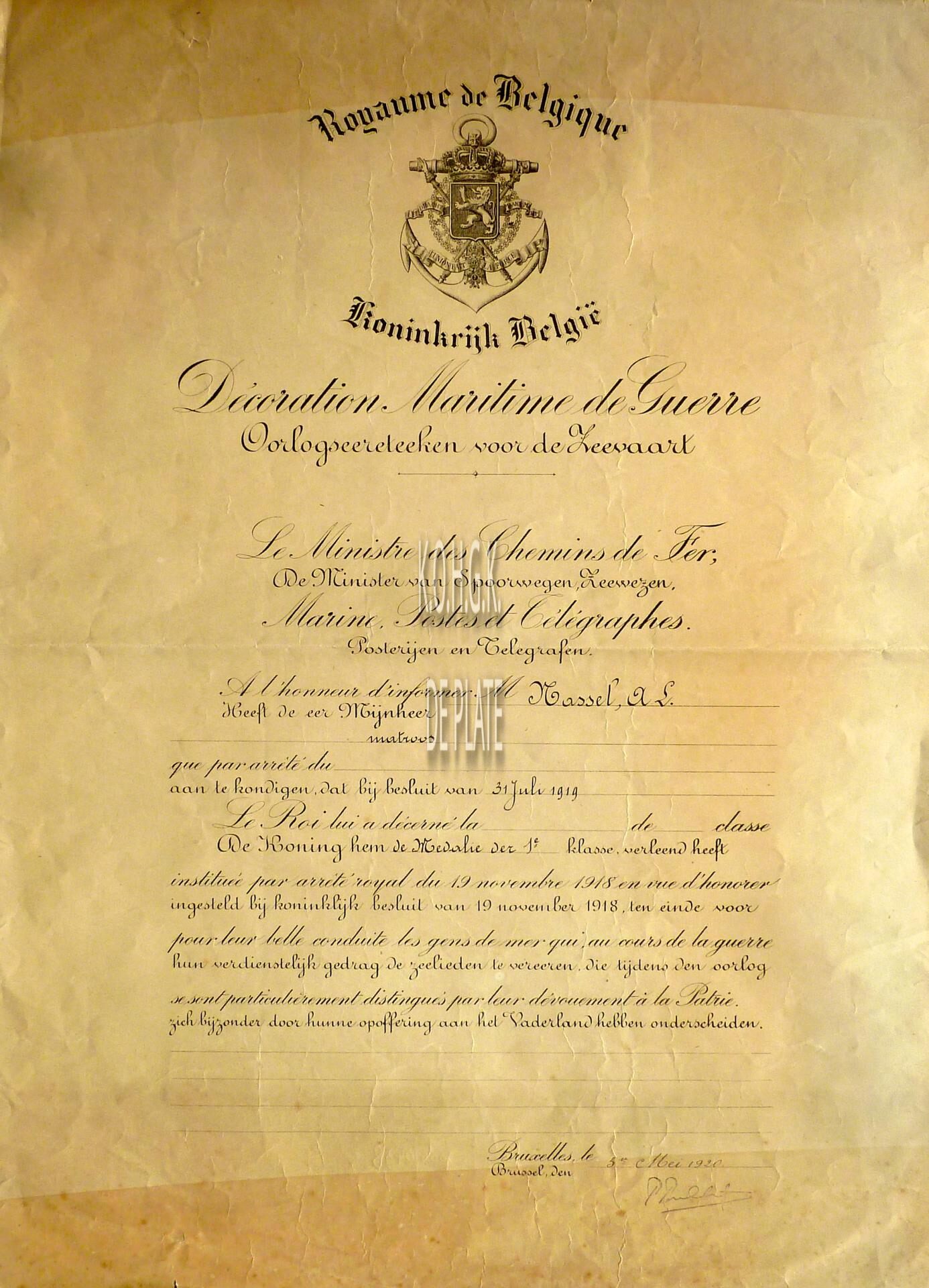 Toegekend bij koninklijk besluit van 19/11/1918 door de Minister van Spoorwegen, Zeewezen, Posterijen en Telegrafen voor het vereren van het verdienstelijk gedrag der zeelieden en in het bijzonder voor hun opoffering aan het Vaderland tijdens de oorlog. - (De Eerste Wereldoorlog)
