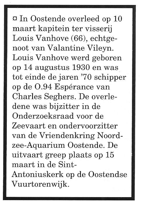 In Oostende overleed op 10 maart kapitein ter visserij Louis Vanhove (66), echtgenoot van Valantine Vileyn...