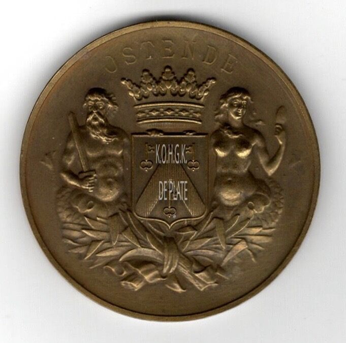 Op de voorzijde : rondom boven OSTENDE, centraal het gekroonde wapenschild met keper en drie sleutels van de stad Oostende, geflankeerd door twee schildhouders, links meerman met zwaard naar links kijkend, rechts meermin met handspiegel naar rechts kijkend, alles geplaatst op palmbladeren samengebonden met een lint