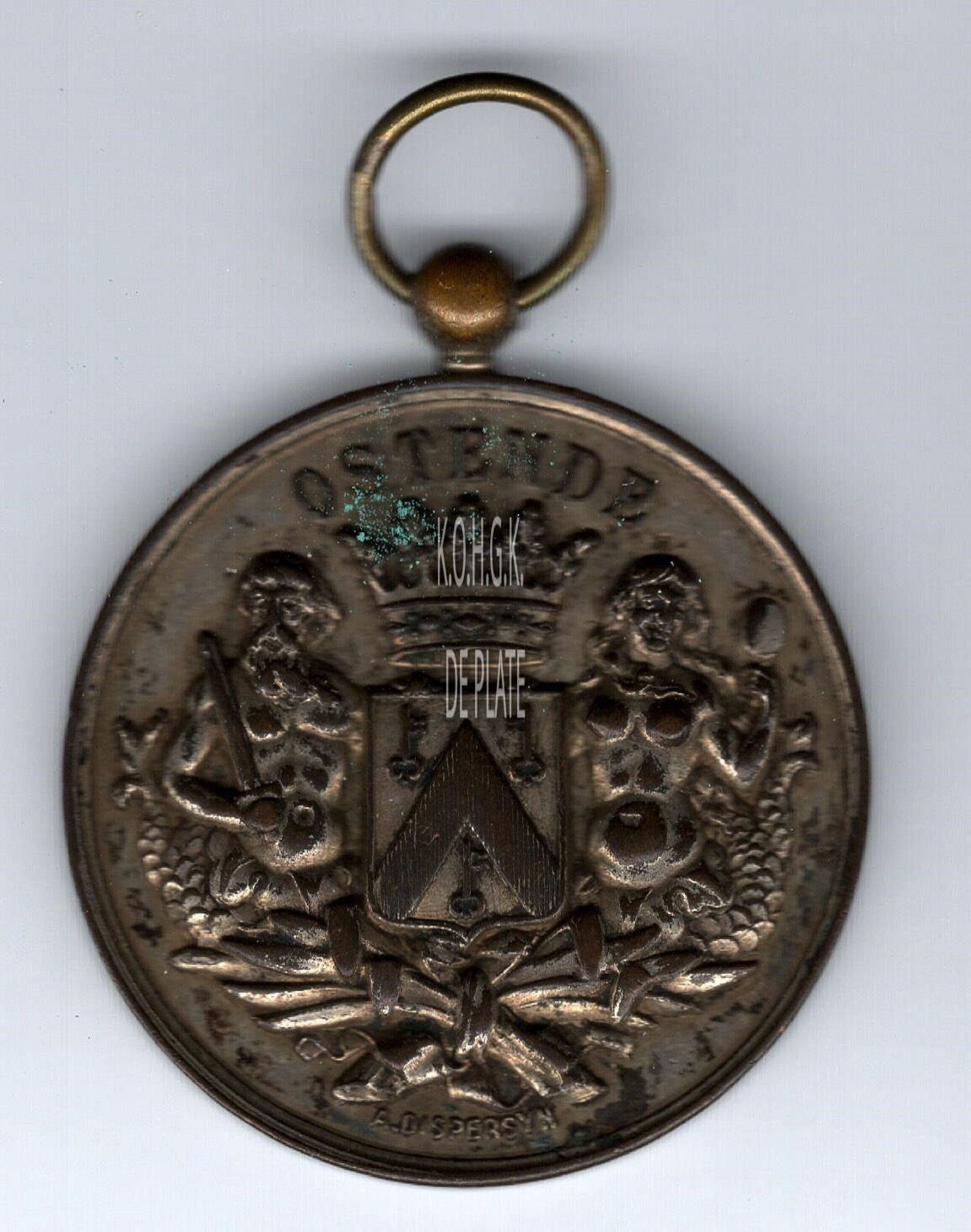 Op de voorzijde : rondom boven • OSTENDE; centraal het gekroonde wapenschild met keper en drie sleutels van de stad Oostende, geflankeerd door twee schildhouders, links meerman met zwaard naar links kijkend, rechts meermin met handspiegel naar rechts kijkend, alles geplaatst op palmbladeren samengebonden met een lint, midden onder gesigneerd A. DISPERSYN