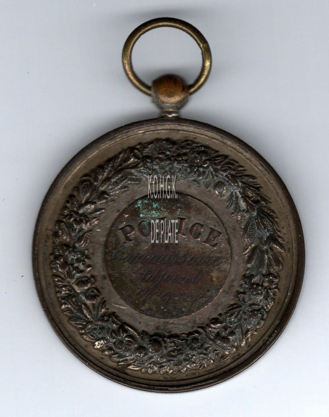 Op de keerzijde : rondom een gevlochten krans van bloemen en noten, centraal in een binnencirkel rondom boven POLICE / COMMISSAIRE / ADJOINT / V.V.J.