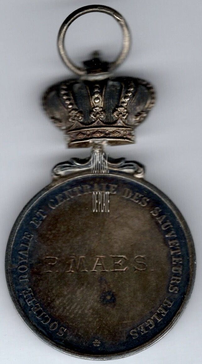 Op de keerzijde : rondom SOCIETE ROYALE ET CENTRALE DES SAUVETEURS BELGE •, centraal horizontaal P. MAES