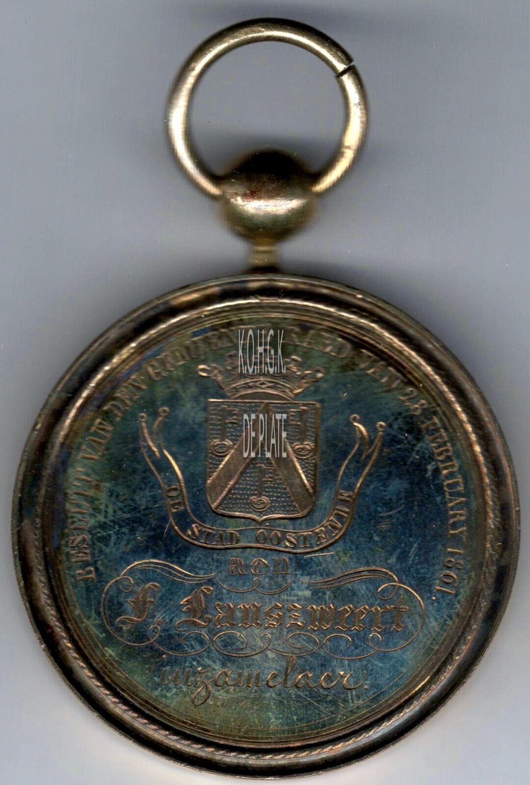 Op de voorzijde : rondom boven BESLUIT VAN DE GEMEENTERAED VAN 28 FEBRUARI 1861, centraal boven het gekroonde wapenschild van Oostende met daaronder op een lint DE STAD OOSTENDE, daar onder horizontaal AEN / F. LANSZWEERT / INZAMELAER