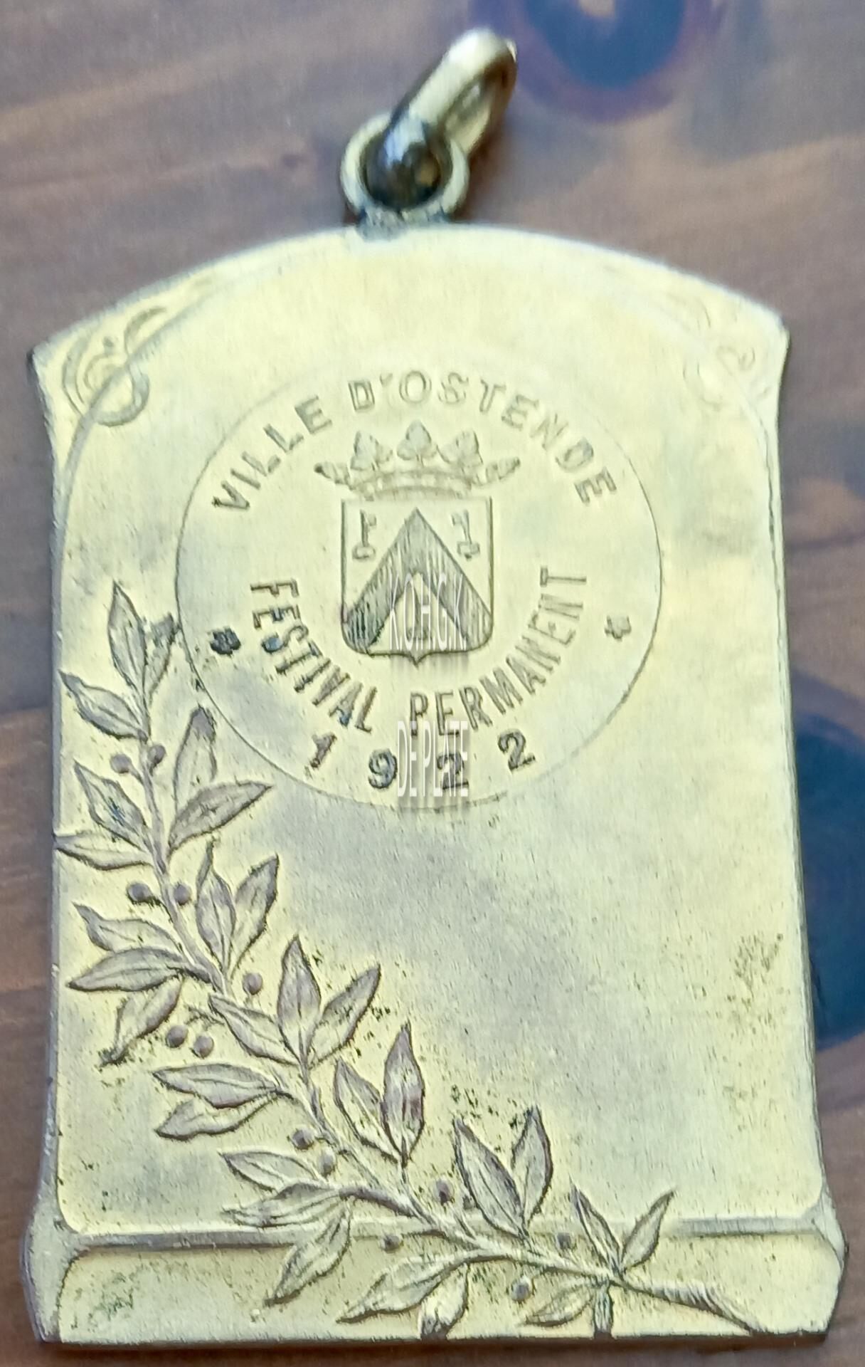 Op de keerzijde : van rechtsonder naar links midden een lauriertak, in beide bovenhoeken een versiering, centraal in een matrijs in de bovenste helft rondom VILLE D’OSTENDE, rondom onder FESTIVAL PERMANENT / ✿ 1922 ✿, centraal het gekroonde wapenschild met keper en drie sleutels van de stad Oostende