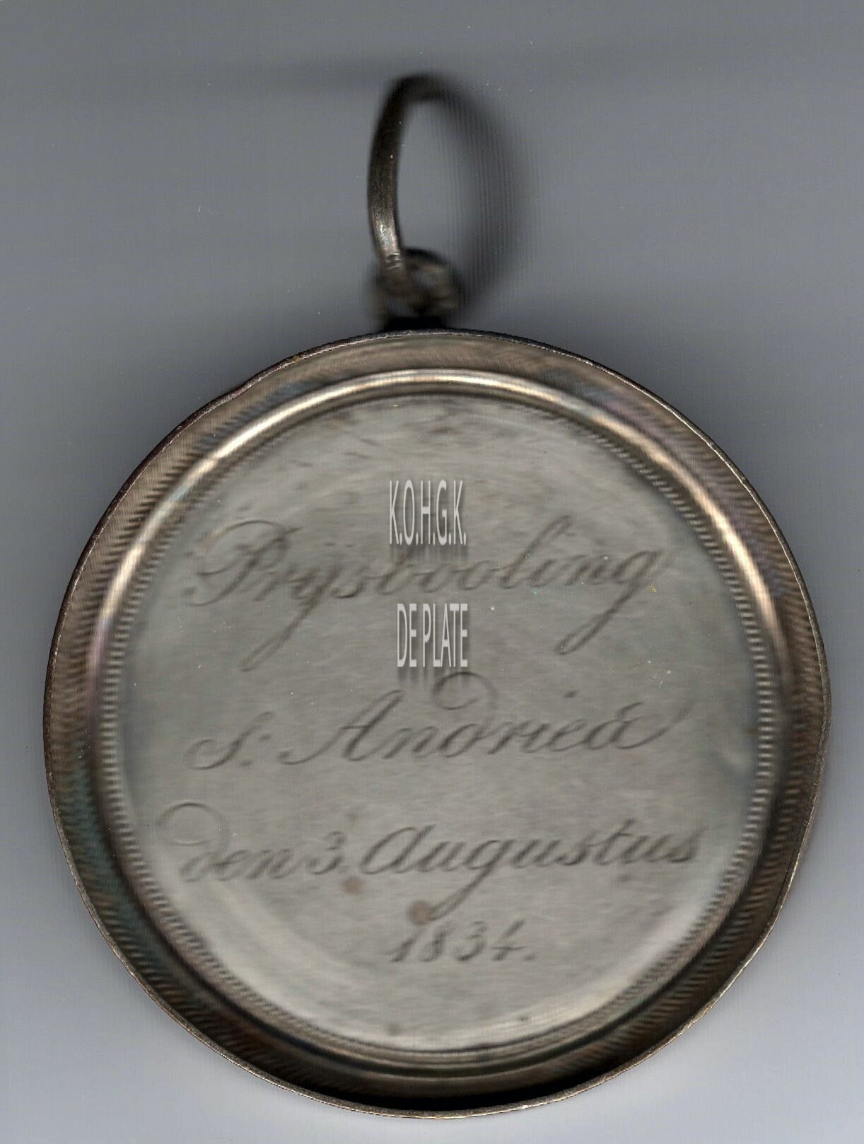De prijspenning is rond met gladde randin een vatting met gladde geprofileerde rand, met oog en ring en is als volgt ingegraveerd