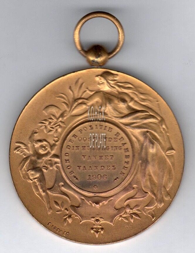 Op de keerzijde : centraal in een binnencirkel rondom ➻ BOND DER POLITIE BEAMBTEN ➻,horizontaal OOSTENDE / INHULDIGING / VAN HET / VAANDEL / 1906 / ✿, In de buitencirkel rondom Kalliope, de muze van het heldendicht, de zang, de filosofie en de retoriek met in haar linkerhand haar blazoen, in haar rechterhand een palm- en lauriertak uitreikend naar een dansende engel (links) met opgeheven armen, linksonder gesigneerd FISH & CIE