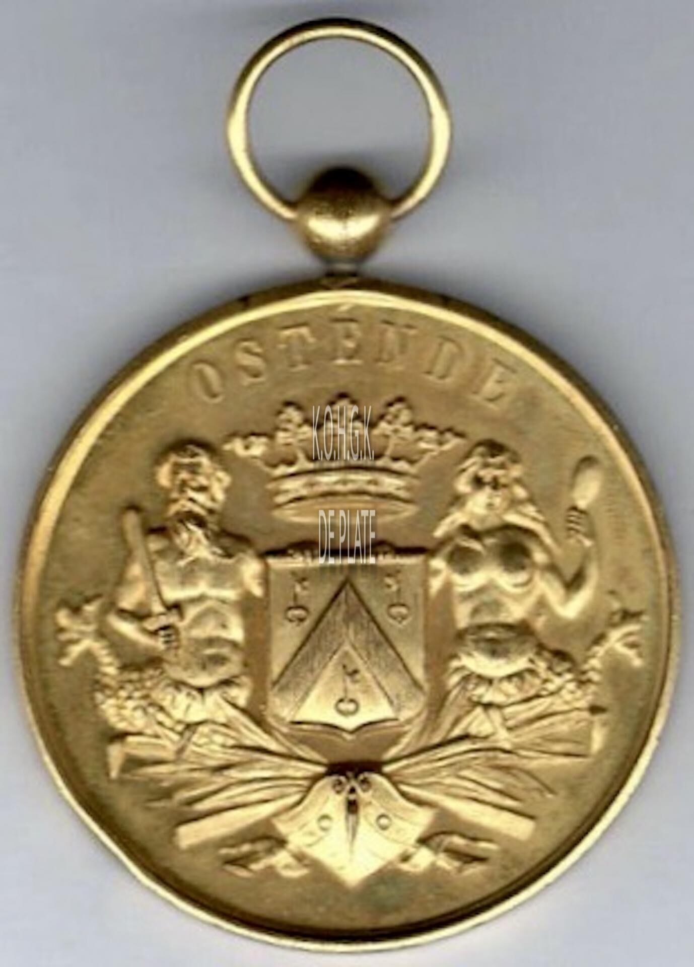 Op de voorzijde : rondom boven OSTENDE, centraal het gekroonde wapenschild met keper en drie sleutels van de stad Oostende, geflankeerd door twee schildhouders, links meerman met zwaard naar links kijkend, rechts meermin met handspiegel naar rechts kijkend, geplaatst boven een boeg op zee en gevuld met palmbladeren en twee gekruiste roeispanen