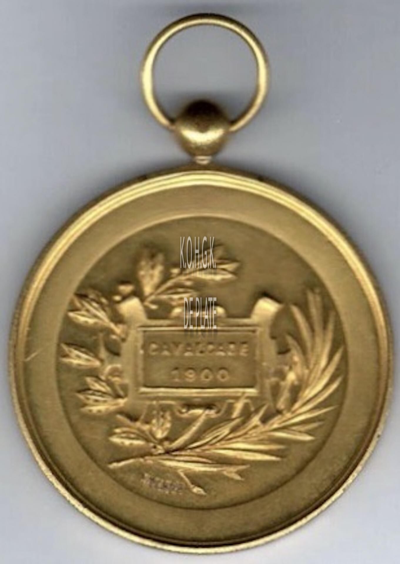 Op de keerzijde : centraal links een lauriertak en rechts een palmtak onderaan samengestrikt, erboven op een pancarte CAVALCADE / 1900, gesigneerd linksonder (niet leesbaar)