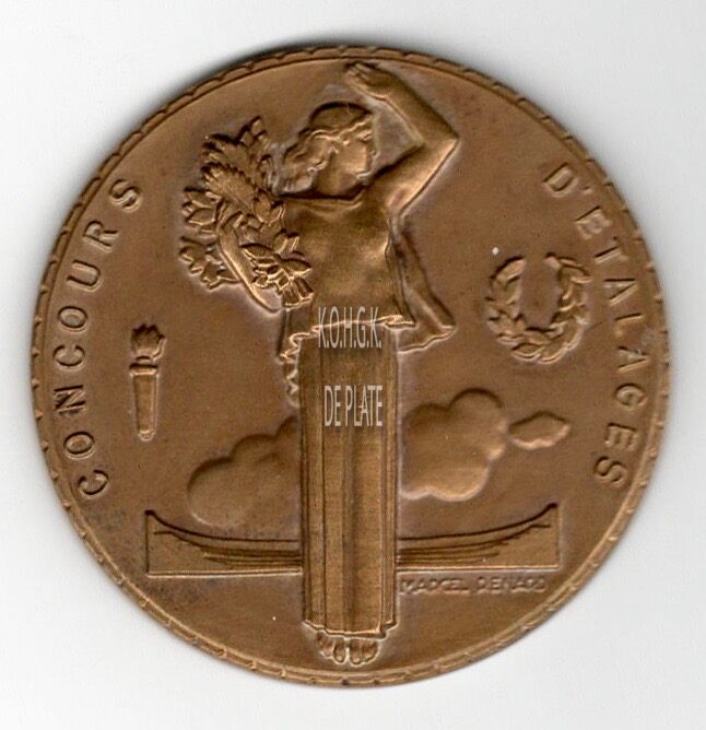Op de voorzijde : de rand is ingesneden, Allegorie ‘De roem’ : centraal in het midden een zegevierende vrouw in lang gewaad  naar rechts kijkend met bloemenkrans in haar rechterarm, zwaaiend met de linkerarm. In de achtergrond een tribune, links van de vrouw een fakkel, rechts een open laurierkrans, rondom links CONCOURS, rondom rechts D’ETALAGES, gesigneerd onder de rechterkant van de tribune MARCEL RENARD