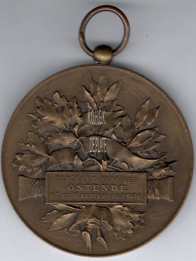 Op de keerzijde : centraal een boeket van eiken- en lauriertakken onderaan met een brede band samengebonden, de band loopt ook door het boeket, boven de band op een rechthoekige plaat staat horizontaal CONCOURS HIPPIQUE / OSTENDE / 15 ET 16 SEPTEMBRE 1906