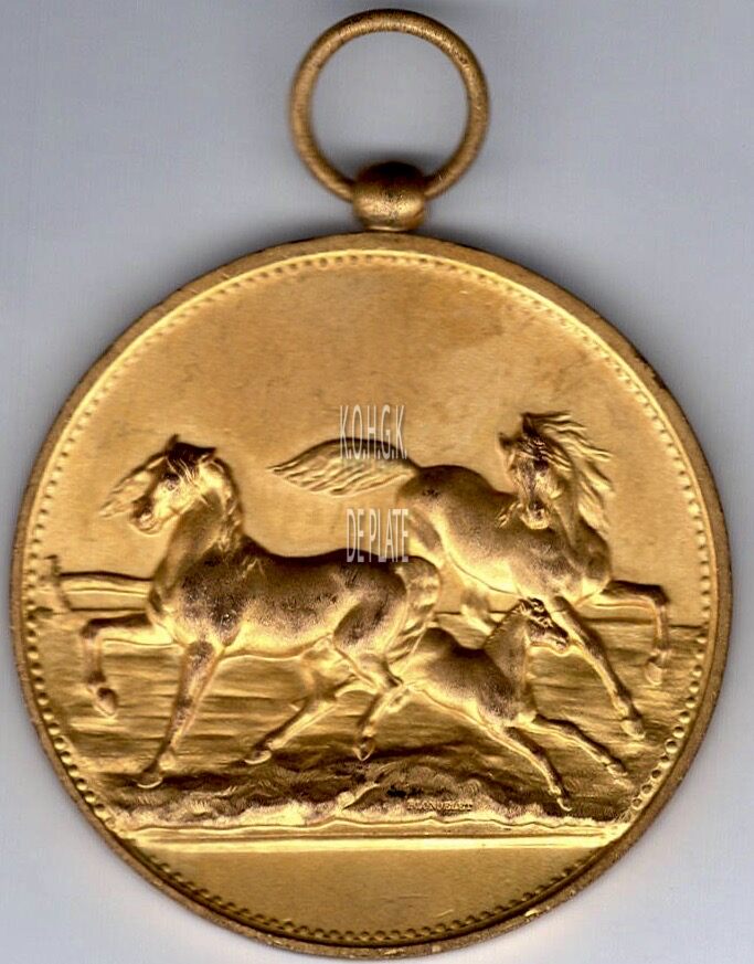 Op de voorzijde : rondom een parelrand, centraal twee rondhuppelde paarden en een veulen aan de vloedlijn.