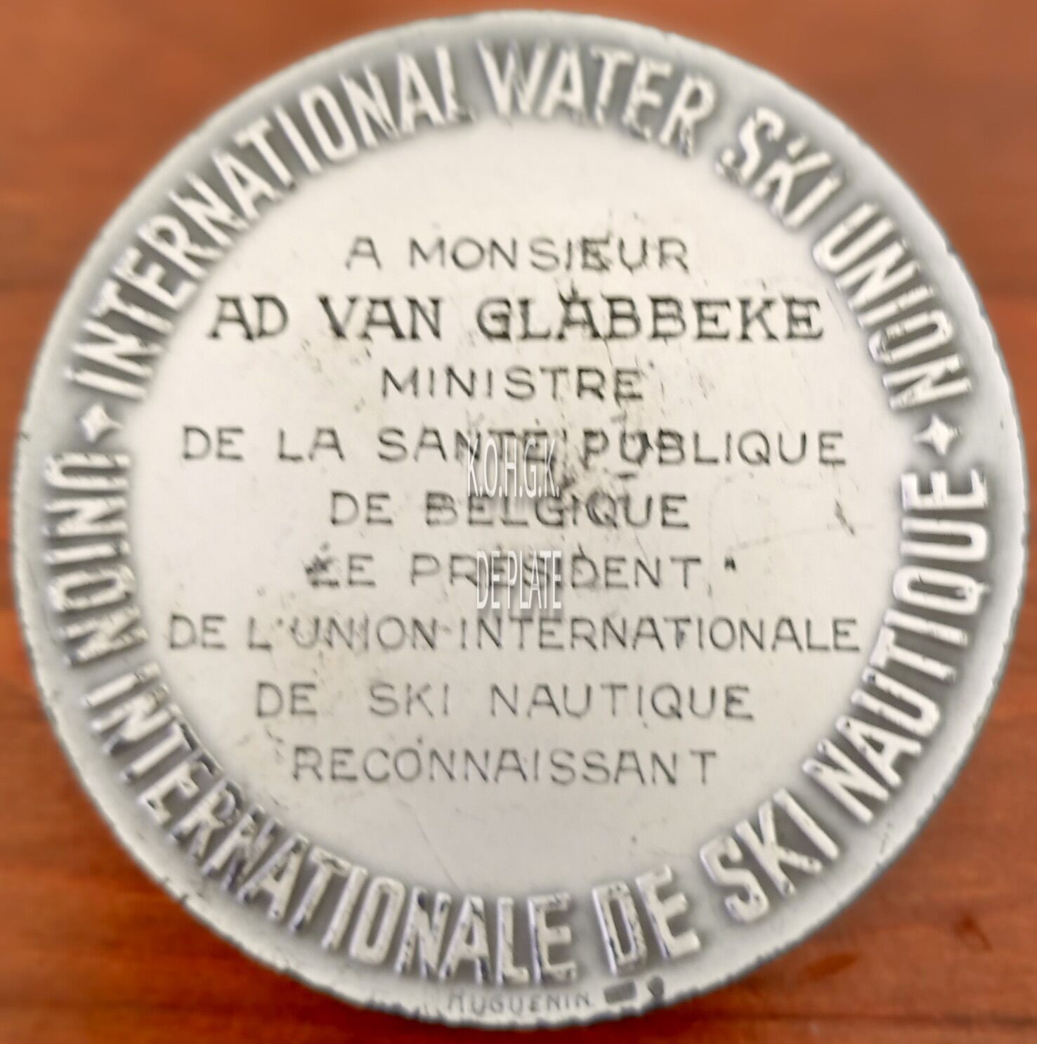 UNIONS INTERNATIONALE DE SKI NAUTIQUE, central horizontal A MONSIEUR / AD. VAN GLABBEKE / MINISTRE / DE LA SANTE PUBLIQUE / DE BELGIQUE / LE PRESIDENT / DE L’UNION INTERNATIONALE / DE SKI NAUTIQUE / RECONNAISSANT, onderaan gesigneerd HUEGENIN – • (ingeslagen)