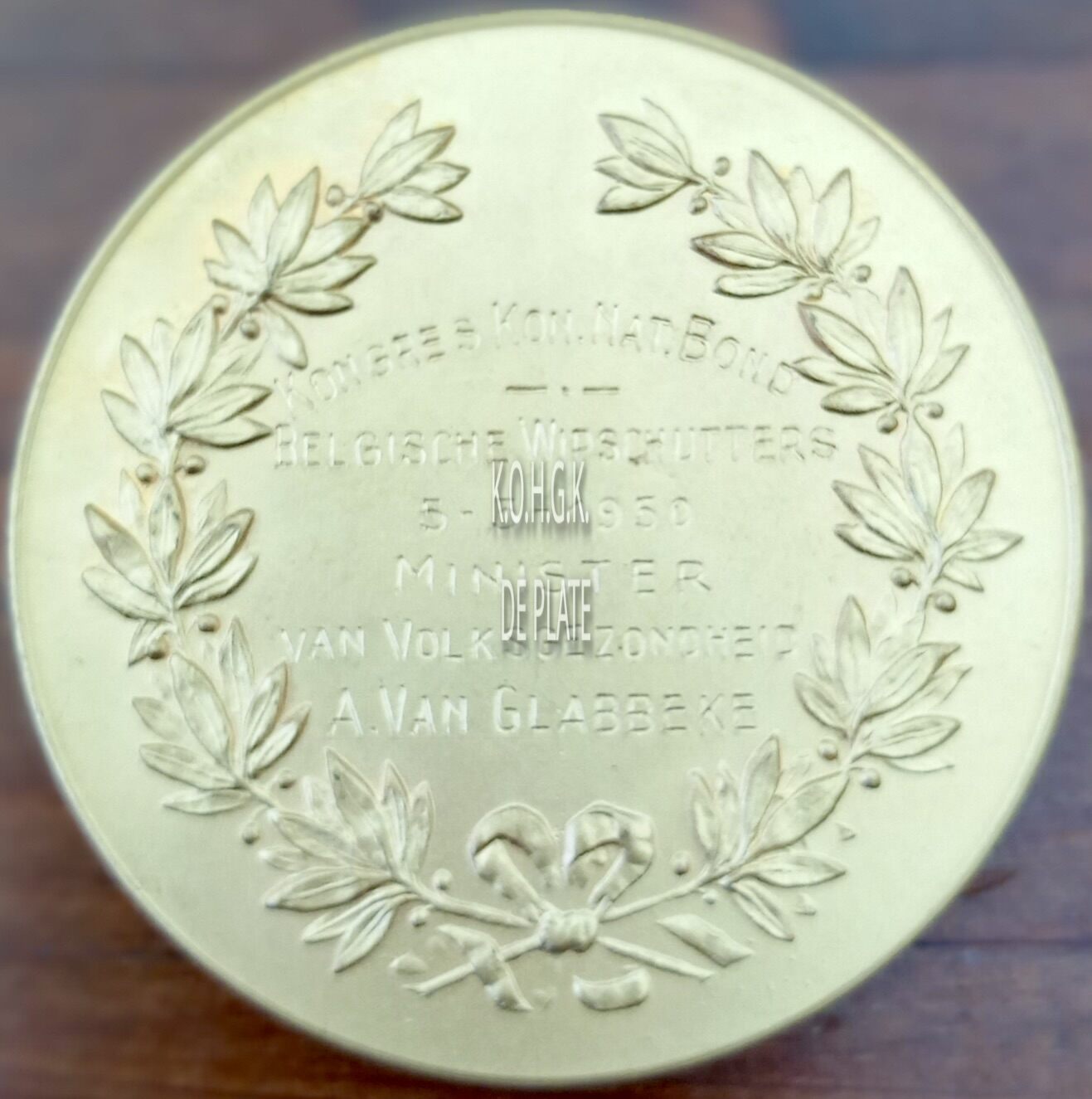 Op de keerzijde : rondom een open eikenkrans onderaan samengestrikt, horizontaal KONGRES KON. NAT. BOND / BELGISCHE WIPSCHUTTERS / 5-3-1950 / MINISTER VAN VOLKGEZONDHEID / A. VAN GLABBEKE
