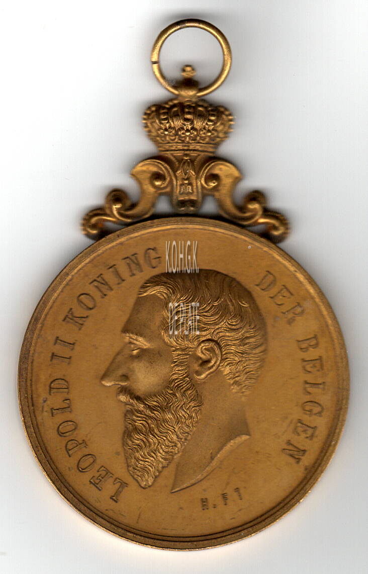 Op de voorzijde : centraal het hoofd van koning Leopold II naar links gericht , rondom LEOPOLD II KONING / DER BELGEN, gesigneerd rechtsonder de afsneed H. Ft